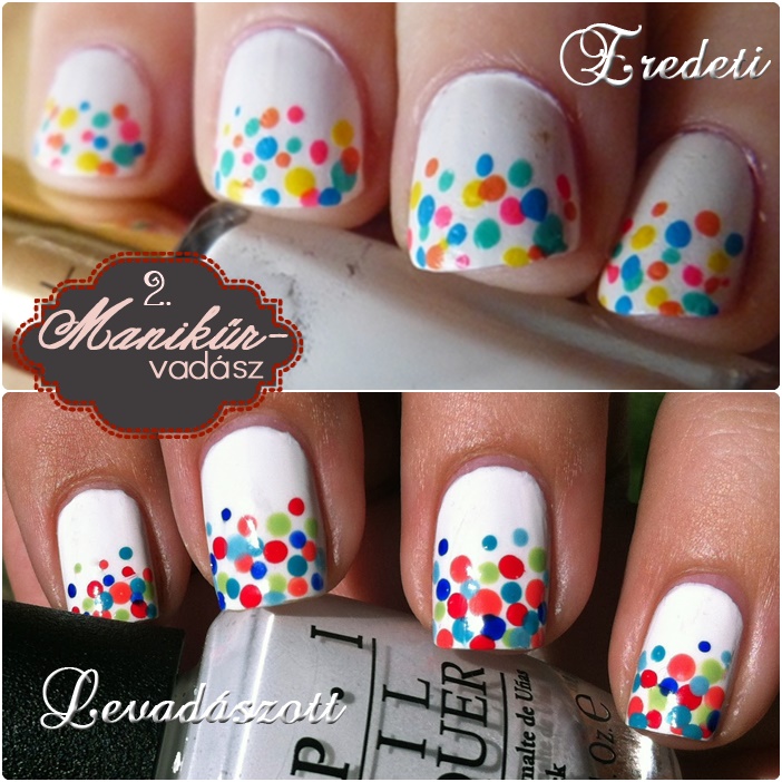21. Eszti a Makeup On A Budget blogról Anett Beutycrumbs blogját kapta a sorsoláson, ahonnan egy igazán "vattacukros", pöttyös, színes manikűrt választott erre a fordulóra.